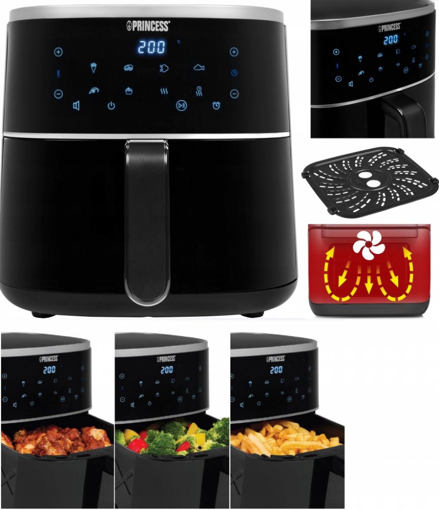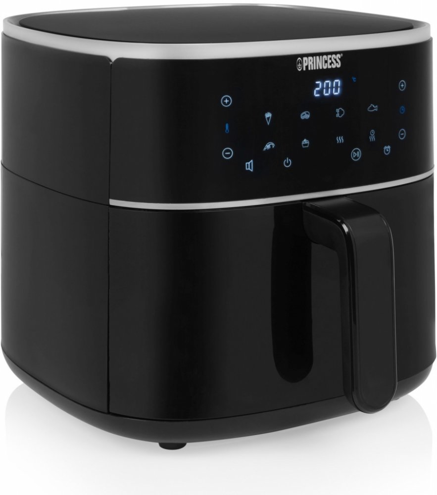 Horkovzdušná fritéza Princess vám umožní připravit oblíbené pokrmy s minimálním množstvím tuku. Nádoba fritézy nabídne nadstandardní objem 6 l. Díky tomu si připravíte až 1,5 kg oblíbených lahůdek. Zásluhou nepřilnavého povrchu se potraviny nepřichytí, údržba fritézy je tak naprosto jednoduchá. V závislosti na typu připravovaného pokrmu si nastavíte teplotu v rozmezí od 80 do 200 °C. Příkon 1500 W...