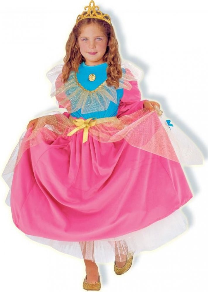 Dlouhé sametové šaty mají růžovou sukni s bílou spodničkou. Kolem pasu je pásek ze zlaté stuhy s mašlí. K ní je přišita vrchní průhledná zlatá sukně s rozparkem k pasu a zlatými hvězdičkami. Vrchní díl je světlemodrý s růžovými dlouhými rukávy. Na hrudníku je zlatá brož a velký zlatý průhledný volán se zlatými hvězdičkami. Kostým je doplněn zlatou korunkou.