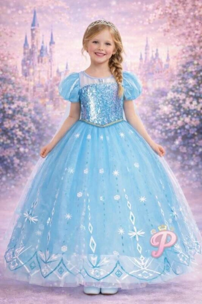 Nádherné modré šaty pro princeznu. Možné jako kostým Elsa z oblíbené pohádky Ledové království - Frozen. Dlouhá odepínací vlečka.