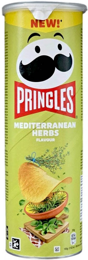 Oblíbené chipsy Pringles s příchutí středomořských bylinek. Složení: sušené brambory, slunečnicový olej, kukuřičná mouka, pšeničná mouka, kořenící směs s příchutí středomořských bylinek (aromata, cukr, modifikovaný škrob, jedlá sůl, droždí v prášku, dextróza, slunečnicový olej, česnekový prášek, cibulový prášek, látky zvýrazňující chuť a vůni (glutaman sodný, 5'ribonukleotidy sodné), byliny (orega...