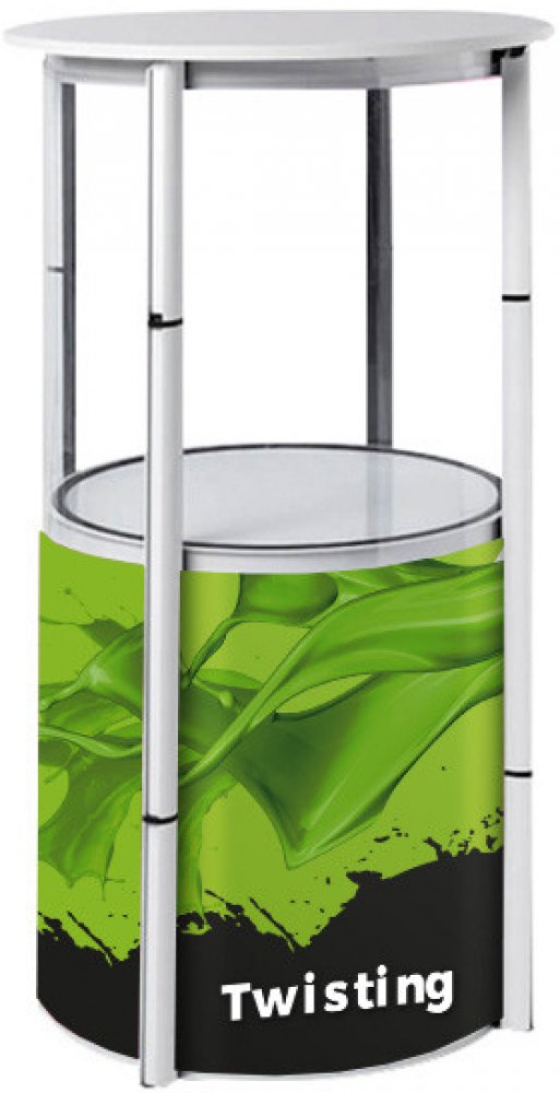Jednoduchý, ale elegantní prezentační promo stolek s potiskem spodní poloviny, kde ta vrchní slouží jako vitrína pro vystavený produkt. Výhodou je efektivní 360° zobrazení jak grafiky, tak vystaveného produktu, který je ještě umocněn nasvícením ve vrchní části. Grafika stolku je natištěna na PVC fólii, je omyvatelná a pro spodní část je potřeba ve čtyřech kusech. Prezentační pult je skvělý pro výs...