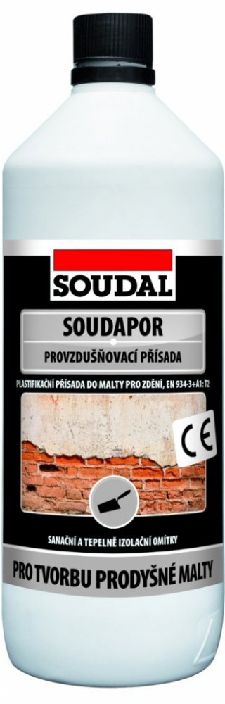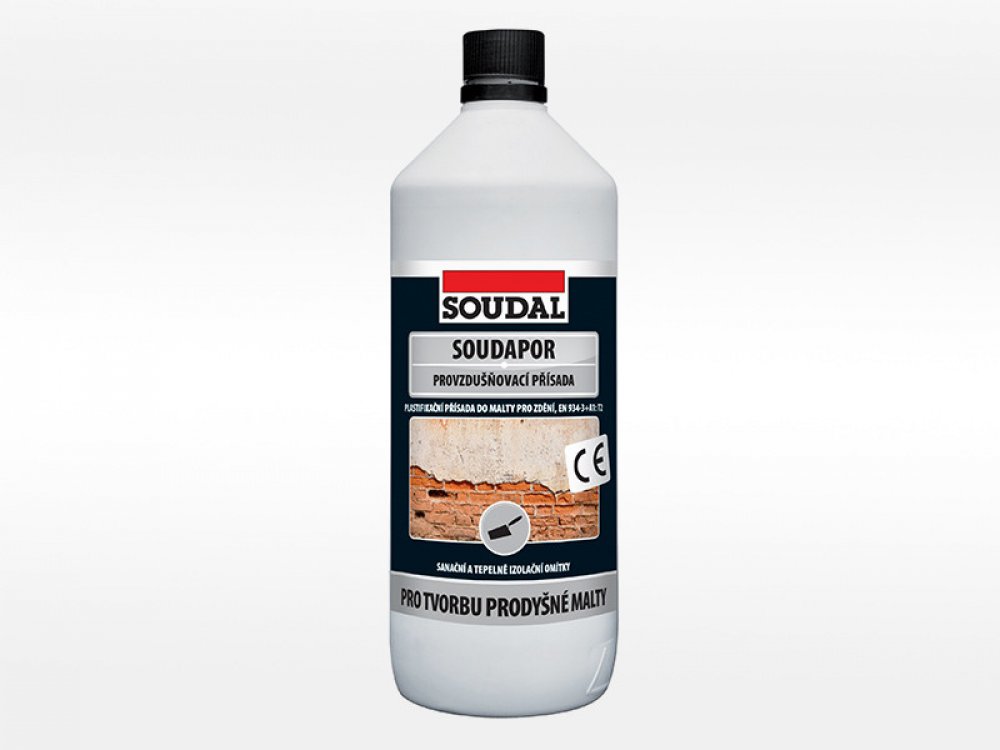 Provzdušňovací přísada Soudapor SOUDAL je je plastifikační a provzdušňovací přísada na přípravu cementových a vápeno-cementových malt se sanačními a tepelně izolačními vlastnostmi. V maltě vytváří stabilní stejnoměrně rozptýlené hydrofobizované vzduchové póry. Zlepšuje zpracovatelnost, usnadňuje nanášení a zvyšuje odolnost proti mrazu a vlhkosti.Jako přísada do vápeno-cementových malt zcela nahradí stabilizačním a plastifikačním účinkem vápno.