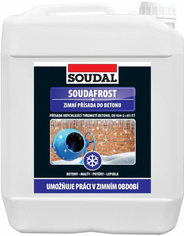 Bezchloridová kapalná přísada Soudafrost pro možnost zpracování cementových hmot za nízkých teplot. Urychluje tvrdnutí směsí jako betony, malty, potěry apod. a zkracuje dobu potřeby jejich tepelné ochrany. Snižuje dávku záměsové vody, zvyšuje počáteční i konečné pevnosti betonu.PoužitíZpracování betonu i jiných stavebních směsí, které obsahují cement, v zimním obdobíBetonování až do teploty -10°CVeškeré práce s cementovými směsmi s nároky na vysokou rychlost nástupu počáteční pevnostiVlastnostiNeobsahuje chloridyZlepšuje zpracovatelnost směsiUmožňuje snížit množství vody ve směsiZkracuje dobu tvrdnutíUrychluje hydratační proces cementuSnižuje teplotu zmrznutí záměsové vodyUmožňuje směsím dosáhnout vysokých počátečních pevností za nízkých teplotChrání armovací výztuže před korozíSpotřebaNad -5°C: 0,5 l na každých 50 kg cementu-5°C až -10°C: 1,0 l na každých 50 kg cementuBalení: 5 l