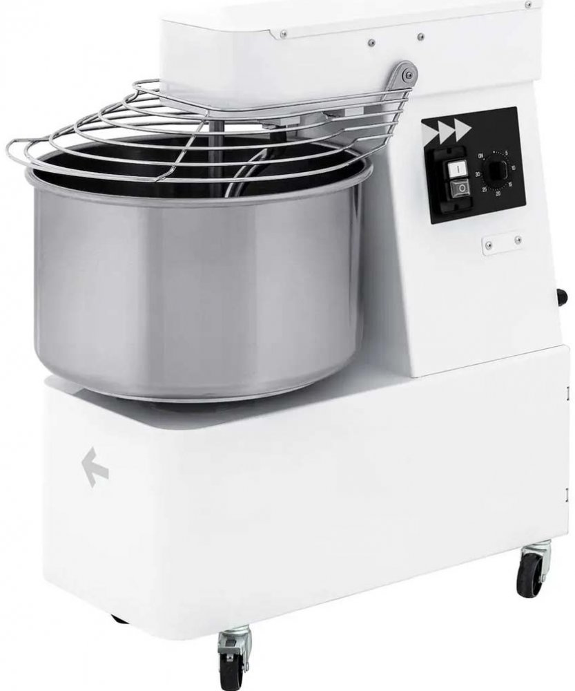 Pro profesionální použití Ideální pro pizzerie, pekárny, cukrárny, výrobny koláčů a koblih k hnětení těžkých těst. Pevný a robustní kryt z bíle lakované oceli Miska, bezpečnostní kryt, spirála z nerezové oceli AISI 304 Pevná mísa a hlava - jednoduchá, osvědčená konstrukce Bezpečnostní kryt mřížky usnadňuje přidávání přísad během provozu Mikrospínač zastaví stroj při otevření bezpečnostního krytu Řetězový pohon pro efektivní provoz Zaručeně tichý provoz díky převodovce s olejovou náplní Vynikající homogenita těsta a provzdušnění Nezahřívá těsto během provozu Vestavěný 30minutový časovač 4 kolečka, 2 s brzdou pro pohodlnou přepravu a snadné použití v kuchyni. Rozměry mísy (mm): ?260x (V)200