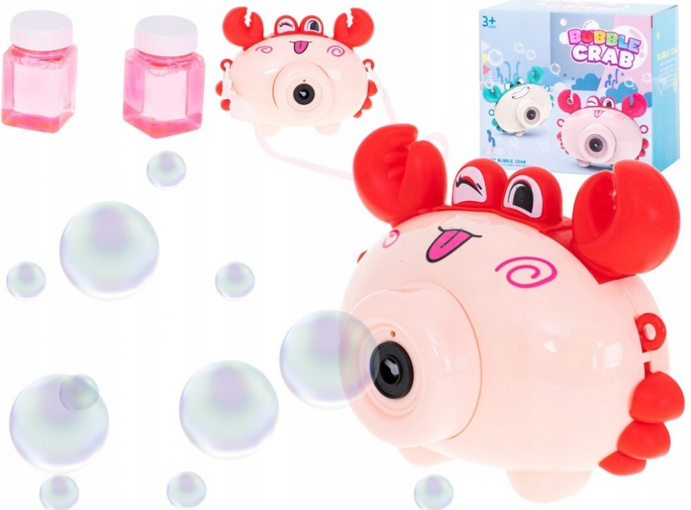 Stroj na mýdlové bubliny připomínající fotoaparát ve tvaru kraba. Obsahuje: fotoaparát, popruh a dvě nádoby s tekutinou. Napájení pomocí baterií: 3x AA (nejsou součástí dodávky). K dispozici v červené a bílé barvě. Rozměry: 15,5x7,5x13 cm.