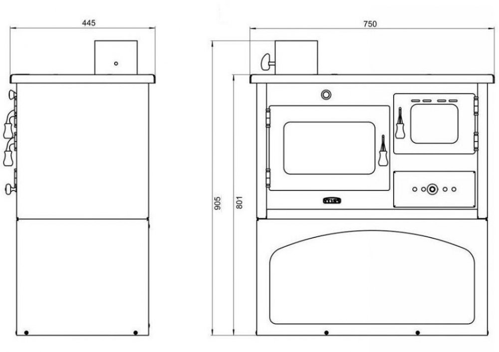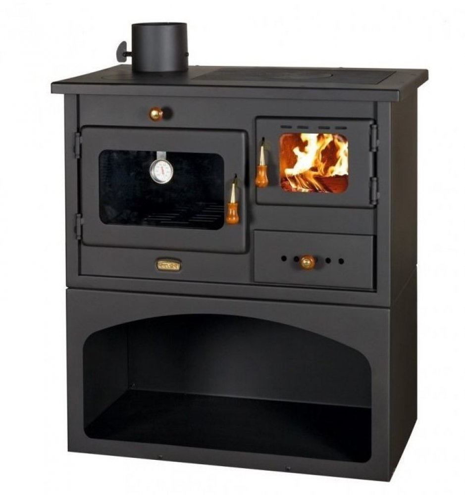 Praktický a výkonný sporák. Levostranné provedení. Má plnohodnotnou troubu s teploměrem a litinovou varnou plotnu. Ohniště je vyloženo šamotovými deskami, součástí je litinový rošt. Přívod primárního vzduchu je regulovatelný přes popelník. Materiál: 3+4 mm plech, samovypalovací černá barva.
