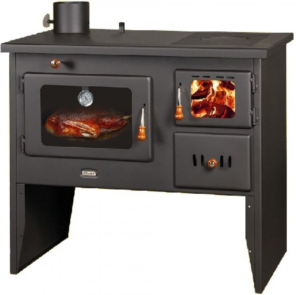 Praktický a výkonný sporák s teplovodním výměníkem, litinovou varnou plotnou a plnohodnotnou pečící troubou s teploměrem. Levostranné provedení. Ohniště je vyloženo šamotovými deskami, součástí je litinový rošt. Přívod primárního vzduchu je regulovatelný přes popelník. Materiál: 3+4+5 mm plech, samovypalovací černá barva.
