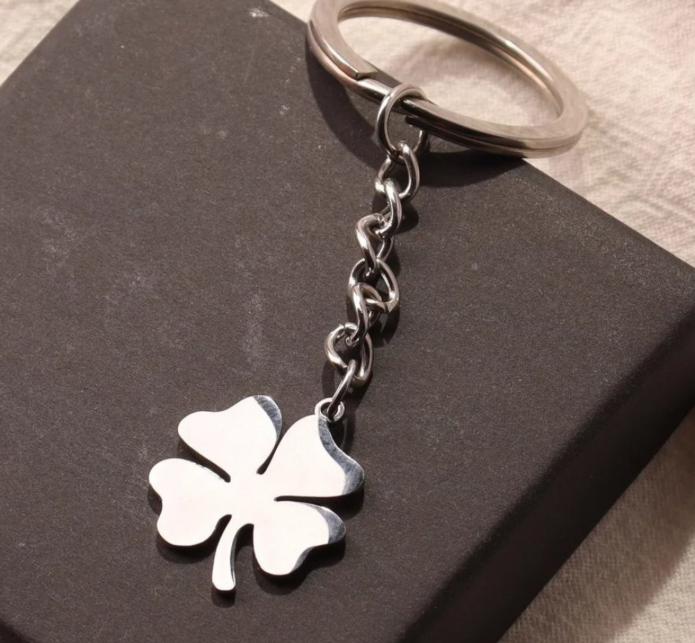 Ocelová klíčenka se čtyřlístkem. Tento čtyřlístek sice na louce neroste, ale i tak může přinést štěstí!