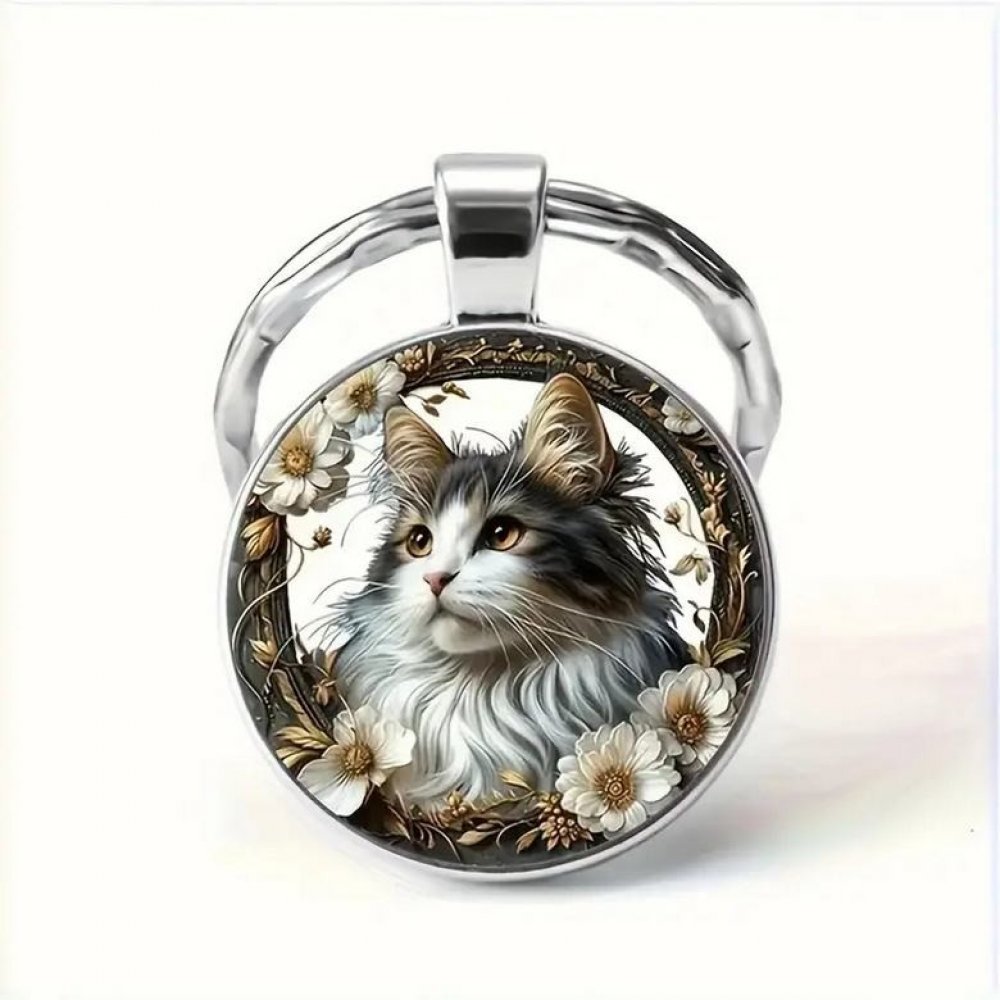 Klíčenka - přívěsek na klíče - s kočkou. Klíčenka kočka se bude skvěle vyjímat na klíčích milovníka koček. Kolem kočky je spousta krásných květin .