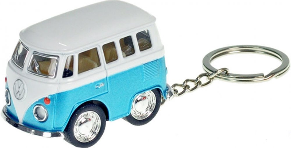 Přívěsek na klíče v podobě mikrobusu Volkswagen. Mikrobus je na zpětný chod.