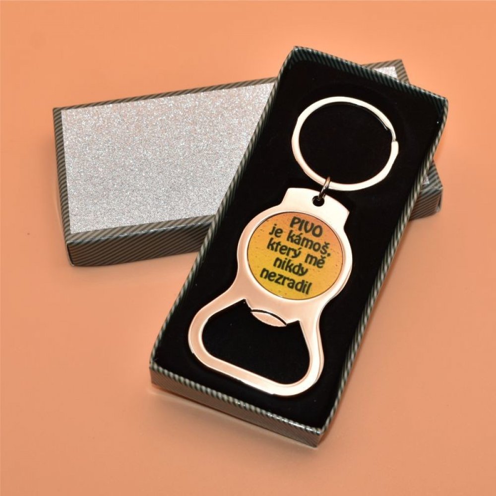 Kovový přívěšek na klíče s otvírákem na láhve. Text: Pivo je kámoš, který mě nikdy nezradil. Klíčenka je zabalena v šedé dárkové krabičce s černou sametovou vložkou.
