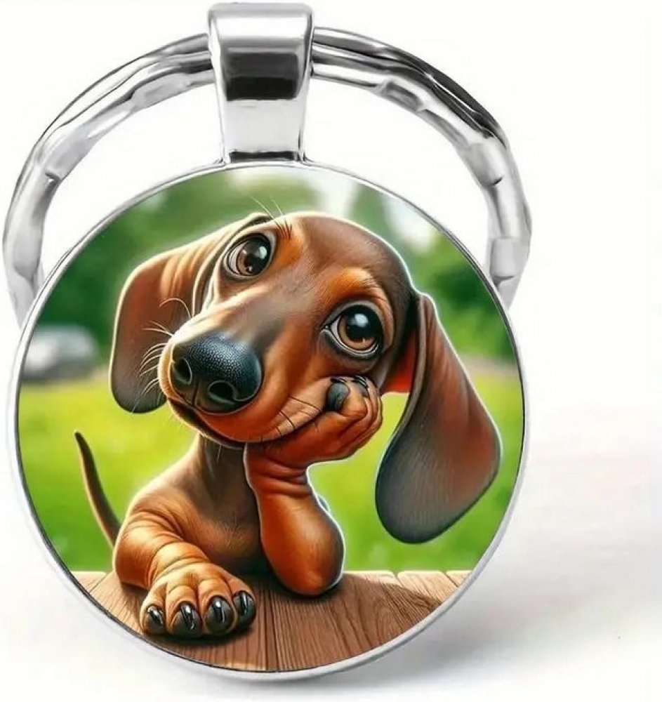Stylový přívěsek na klíče se psem - jezevčíkem. Na přívěsku je roztomilý hnědý jezevčík, který si tlapičkou podpírá hlavu. Klíčenka s populárním plemenem jezevčík je vhodná pro všechny milovníky psů.