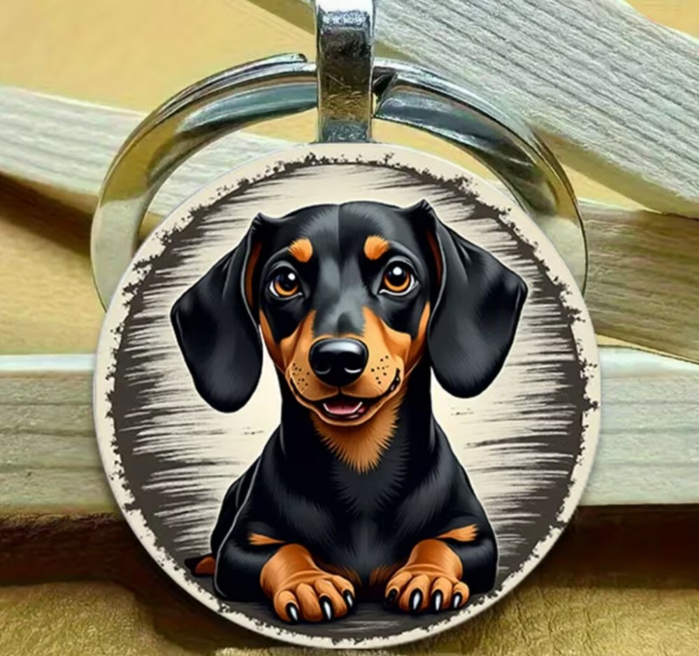 Stylový přívěsek na klíče se psem - jezevčíkem. Na přívěsku je roztomilý jezevčík. Klíčenka s populárním plemenem jezevčík je vhodná pro všechny milovníky psů.