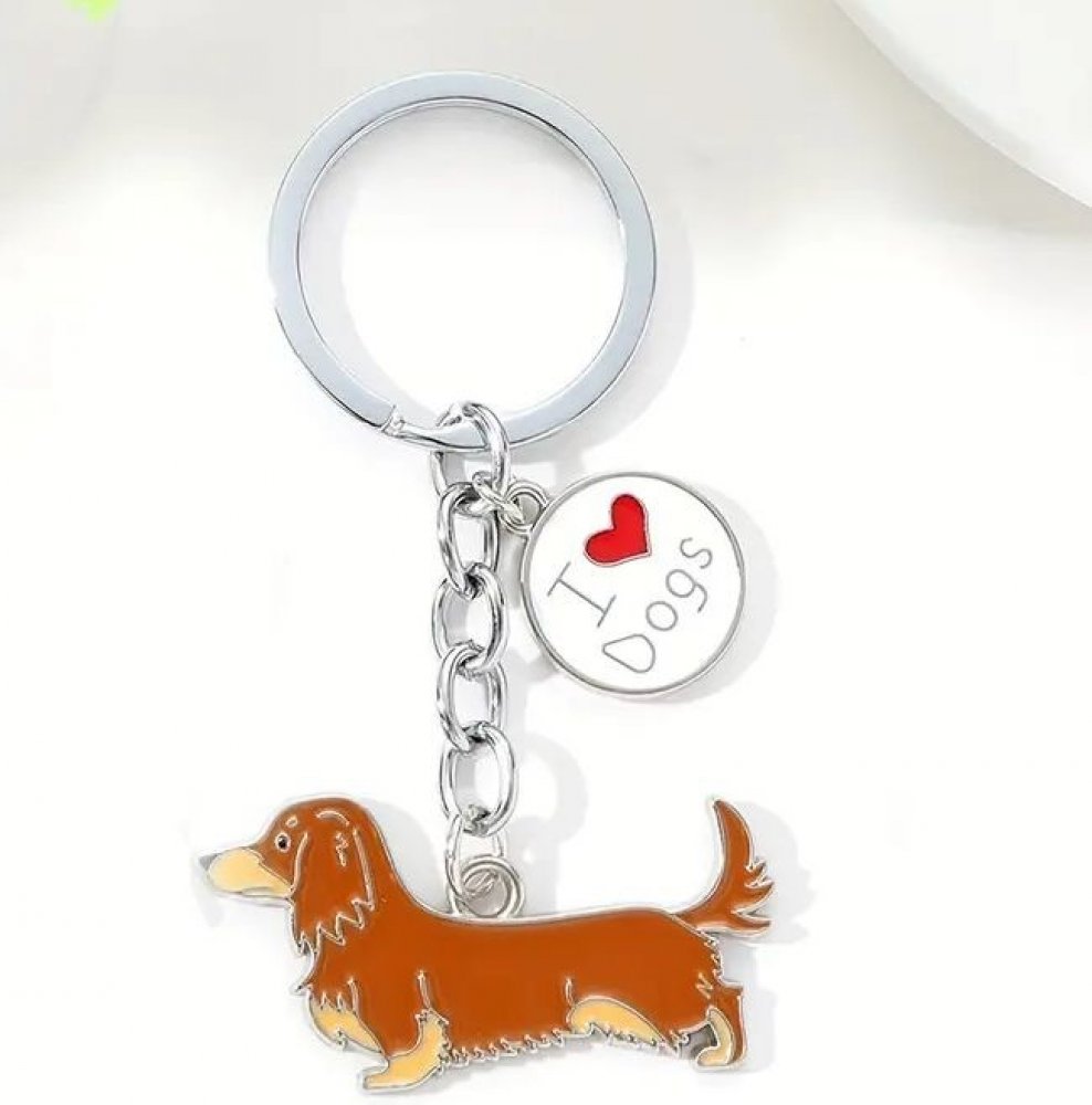 Stylový přívěsek na klíče se psem - jezevčíkem. Na přívěsku je krásný chlupatý hnědý jezevčík s hnědým pálením. Klíčenka s populárním plemenem jezevčík je vhodná pro všechny milovníky psů. Na klíčence je i přívěsek s nápisem I love dogs.