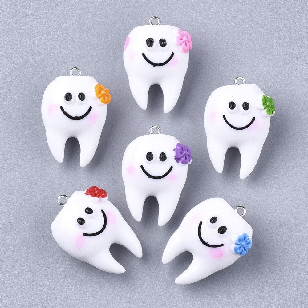Tento přívěsek z tvrzené pryskyřice ve tvaru zubu s květem a úsměvem o rozměrech 32 x 21 x 17 mm je jedinečným a hravým doplňkem. S průvlekem o velikosti 2 mm se snadno připojí na klíčenku, tašku nebo jiný oblíbený předmět. Bílé provedení přívěsku je doplněno květinou v oranžové, fialové, červené, růžové nebo modré barvě, což dodává každému kousku osobitý šarm a barevný akcent.