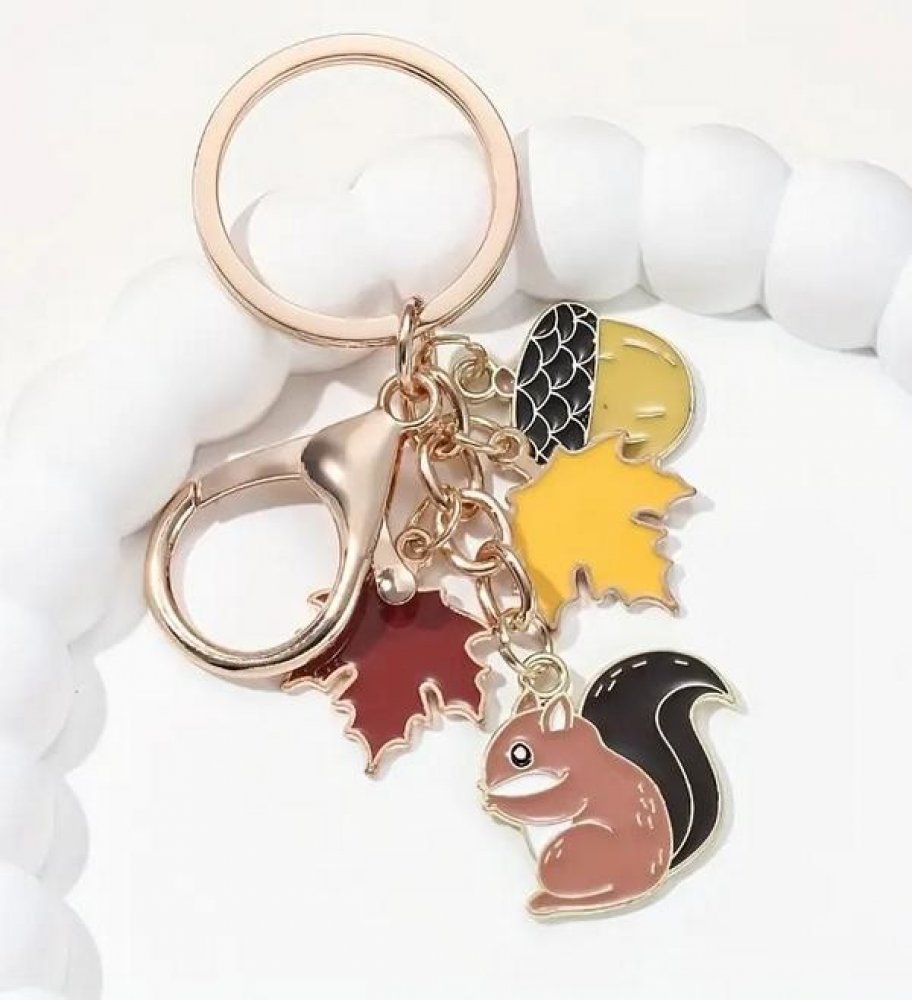 Roztomilá klíčenka - přívěsek na klíče - malá hnědá veverka s oříškem a dvěma podzimními listy.