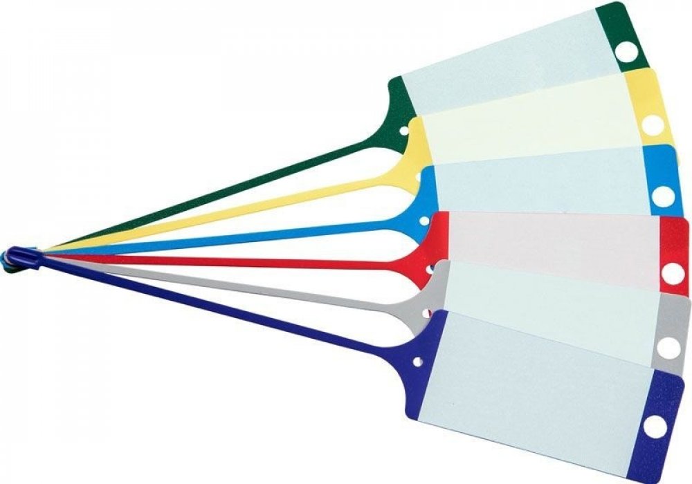 Plastové visačky na klíče s identifikačním štítkem a průvlečným poutkem, v úložném boxu po 100 kusech. - plastový štítek visačky o rozměru 80 x 35 mm s větším otvorem v horní části a menším/průvlečným v dolní části, z té je štítek protažen do tvaru úzkého průvlečného poutka s šípovitou koncovkou, pokud se tato koncovka protáhne kroužkem klíče a následně i menším otvorem štítku, získá jednoduchá, l...