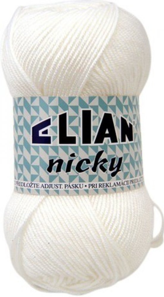 Pletací příze Elian Nicky 208 - bílá z microvlákna, na pletení i háčkování, vhodná pro děti i miminka. Hladké lesklé úplety. Složení: 100% akrylik micro Hmotnost: 50 g Návin: 152 m Jehlice: 3,5 - 4 Háček: 4