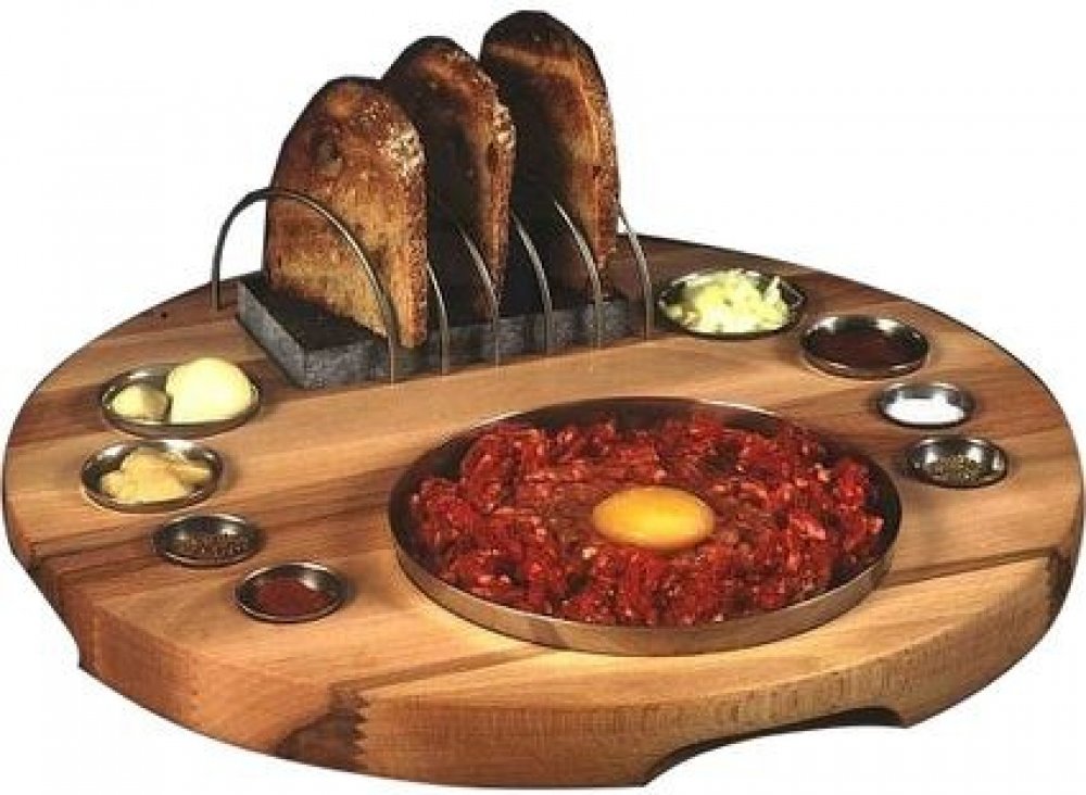 Luxusní servírovací prkénko pro podávání tatarského bifteku nabízí elegantní spojení designu, funkčnosti a kulinářského zážitku. Je vyrobeno z masivního dřeva s precizním opracováním a vybaveno kulatým horkým kamenem na topinky, který umožňuje stylové i praktické nahřátí pečiva přímo při servírování.Součástí prkénka je také sada nerezových mističek na koření, hořčici, máslo, cibuli, sůl a další přísady, které jsou nedílnou součástí servisu tatarského bifteku. Hlavní část je opatřena nerezovým kroužkem pro servírování masa s žloutkem.