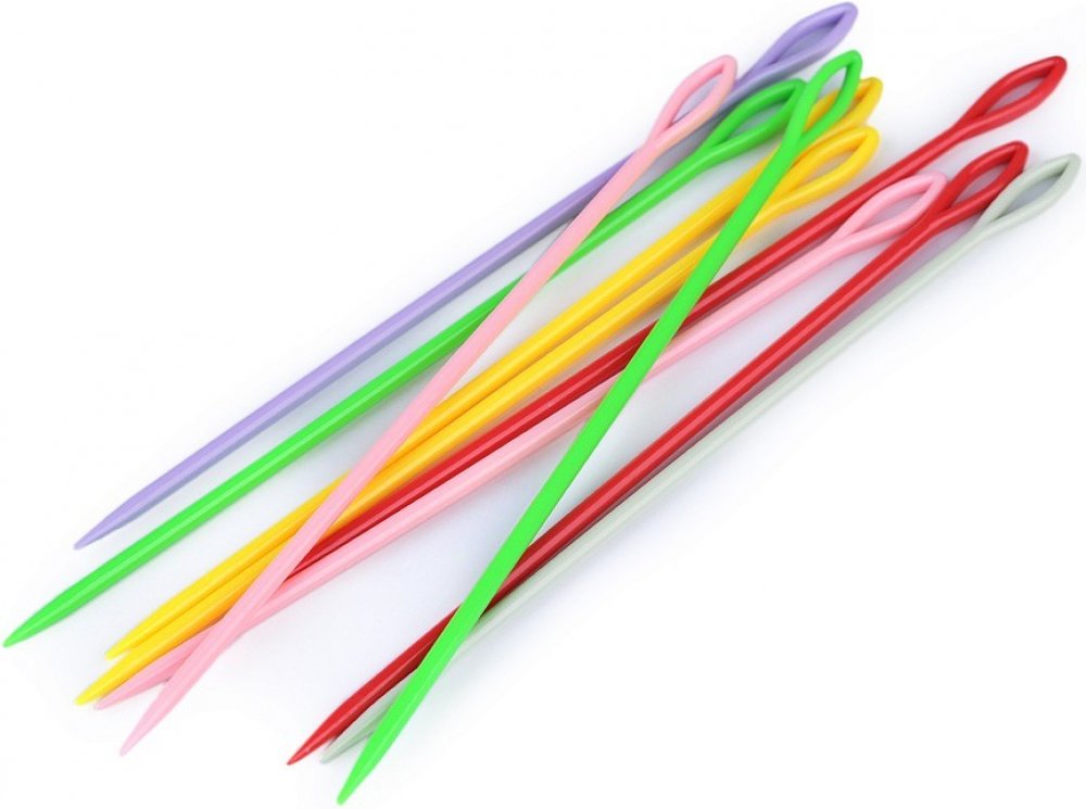 Velké plastové jehly jsou díky velkému očku a tupé špičce vhodné na zapošívání příze při pletení nebo na stužkové vyšívání.