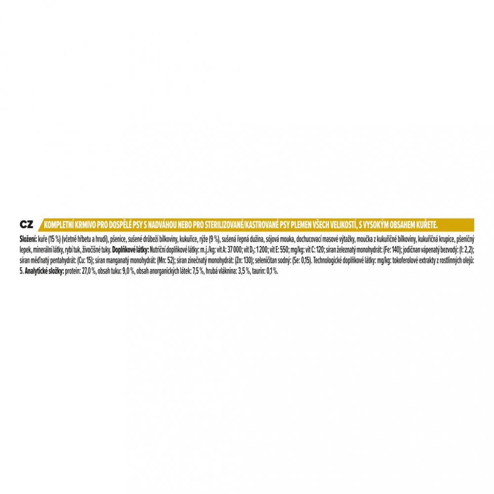 - krmivo má nízký obsah tuku. Nižší obsah tuku pomáhá redukovat aktuální hmotnost nebo ji udržet na požadované hranici