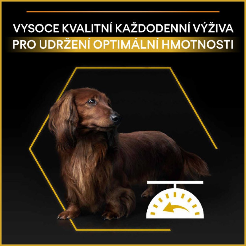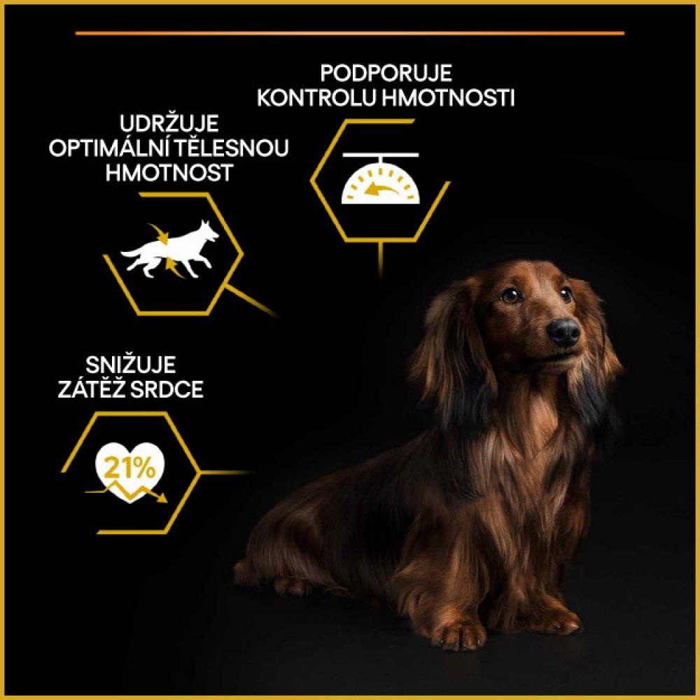 Vyšší obsah bílkovin, nízký obsah tuku, adekvátní obsah vlákniny. Kontrola chuti k příjmu krmiva při zachování podílu svaloviny a současné podpoře zdravých kloubů.