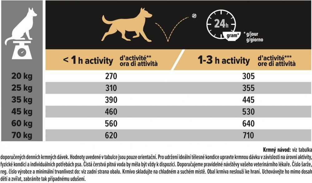 Hodnoty uvedené v tabulce jsou pouze orientační. Pro udržení ideální tělesné kondice upravte krmnou dávku v závislosti na úrovni aktivity, fyzické kondici a individuálních potřebách psa. Čistá čerstvá pitná voda by měla být vždy k dispozici. Doporučujeme pravidelné návštěvy vašeho veterinárního lékaře.