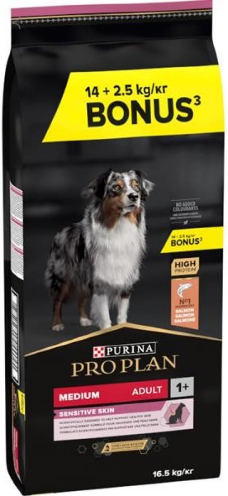 Krmivo Purina PRO PLAN® Sensitive Skin MEDIUM ADULT bylo vyvinuto pro dospělé psy středních plemen (s hmotností 10–25 kg). Granule obsahují vitamín D, minerální látky a specifické množství omega-3 mastných kyselin (0,7 %), které přispívají ke zdraví zubů a dásní. Krmivo má vysoký podíl lososa, a tak zajišťuje optimální výživu středních plemen od 12 měsíců až do 7 let. Následně byste měli přejít na produkty z řady Age Defence.