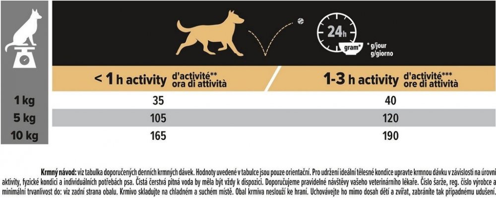 viz tabulka doporučených denních krmných dávek. Hodnoty uvedené v tabulce jsou pouze orientační. Pro udržení ideální tělesné kondice upravte krmnou dávku v závislosti na úrovni aktivity, fyzické kondici a individuálních potřebách psa. Čistá čerstvá pitná voda by měla být vždy k dispozici. Doporučujeme pravidelné návštěvy vašeho veterinárního lékaře.