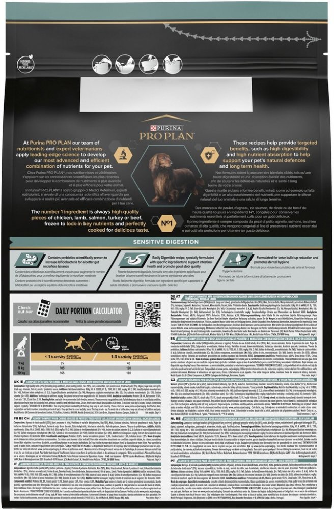 Krmivo Purina PRO PLAN® Sensitive Digestion SMALL&MINI ADULT bylo vyvinuto pro dospělé psy malých a trpasličích plemen (s hmotností méně než 10 kg). Granule obsahují vitamín D a minerální látky, které podporují silné a zdravé zuby. Krmivo má velký podíl vysoce kvalitního jehněčího, a tak zajišťuje optimální výživu malých a trpasličích psů od 12 měsíců věku do 9 let. Následně byste měli přejít na produkty z řady Age Defence.