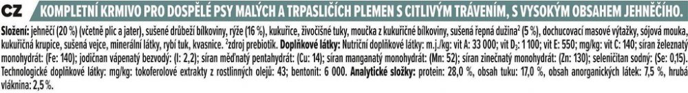 Nestlé Česko pro dospělé pro malá a velmi malá plemena s běžnou aktivitou jehněčí Pro Plan 3 kg superprémiové suché na trávicí ústrojí Sensitive Digestion 28 % rýže 3 kg ze Švýcarska střední (200-500mg) 17 % 2.5 % 7.5 % standardní standardní (<25%) standardní základní pasivní (prebiotika) možné částečná (země výroby)