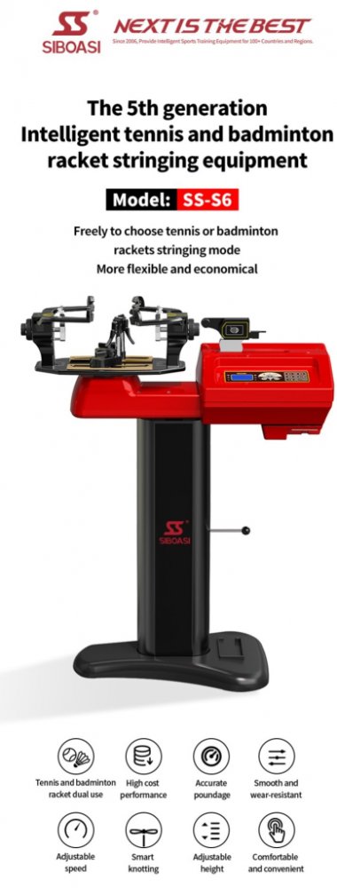 NOVINKA :Elektronický tenisový vyplétací stroj S6.Profesionální vyplétací stroj pro dokonalé vypletení tenisových, squashových a badmintonových raket včetně příslušenství pro vyplétaní raket.Elektronický tenisový vyplétací stroj Siboasi S6 - NOVINKAElektronický vyplétací stroj S6 včetně stojanu - je profesionální model pro dokonalé vypletení tenisových, squashových a badmintonových raket . V ceně je zahrnut vyplétací stroj S6 včetně příslušenství.Lineární vyplétací hlava umožňuje velmi pohodlné a rychlé napínání struny.Pohodlný rychloupínací systém rakety a to díky odolným úchopům z kalené oceli. Díky vysoce přesným senzorům stroj umožňuje velmi přesné nastavení napětí po 0,1 kg / lb v rozmezí od 4,5 – 40 kg nebo 10 – 90 LB. Stroj se snadno ovládá díky LCM displeji s vysokým rozlišením a velké klávesnici s mnoha speciálními funkcemi (konstantní tah, vyplétací rychlost, paměťová tlačítka, zvuk a další). 6-bodový montážní systém umožňuje vyplétat tenisové, squashové a badmintonové rakety.Kvalitní dvojitý klešťový systém s automatickým uvolněním kleštíDiamantový vnitřní povrch kleští2 balíkyrozměr balení : 80x60x60cm , 65x36x36cmváha balení celkem: 80kg