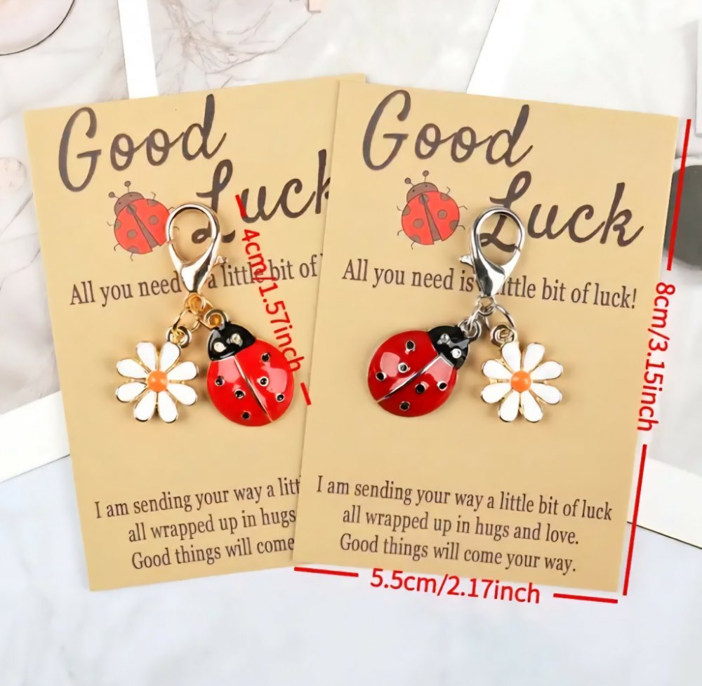 Každý přívěsek je navíc umístěn na stylové dárkové kartičce s nápisem "Good Luck" a milým anglickým vzkazem, který v překladu znamená: "Vše, co potřebuješ, je trocha štěstí! Posílám ti kousek štěstí zabalený v objetí a lásce. Dobré věci přijdou i tvou cestou."