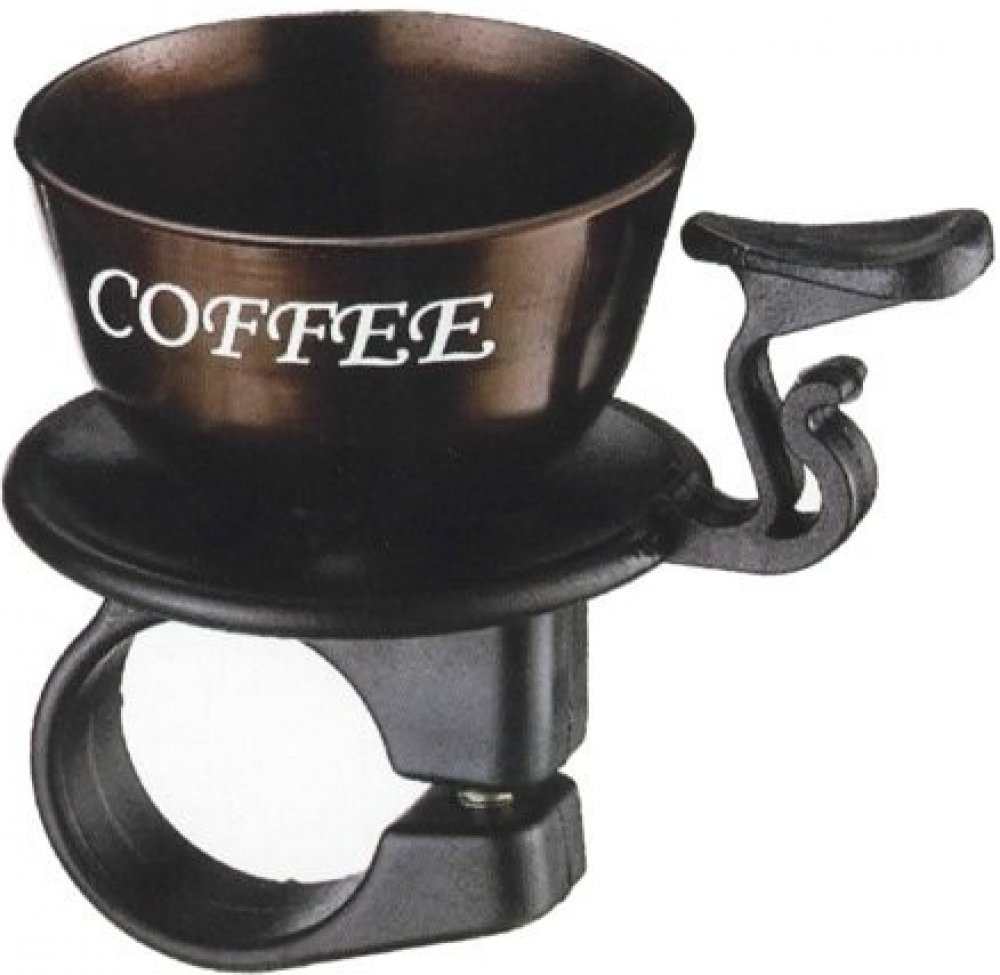 Dekorativní, originálně tvarovaný zvonek na kolo ve tvaru kávového šálku, s vysokým a hlasitým tónem.