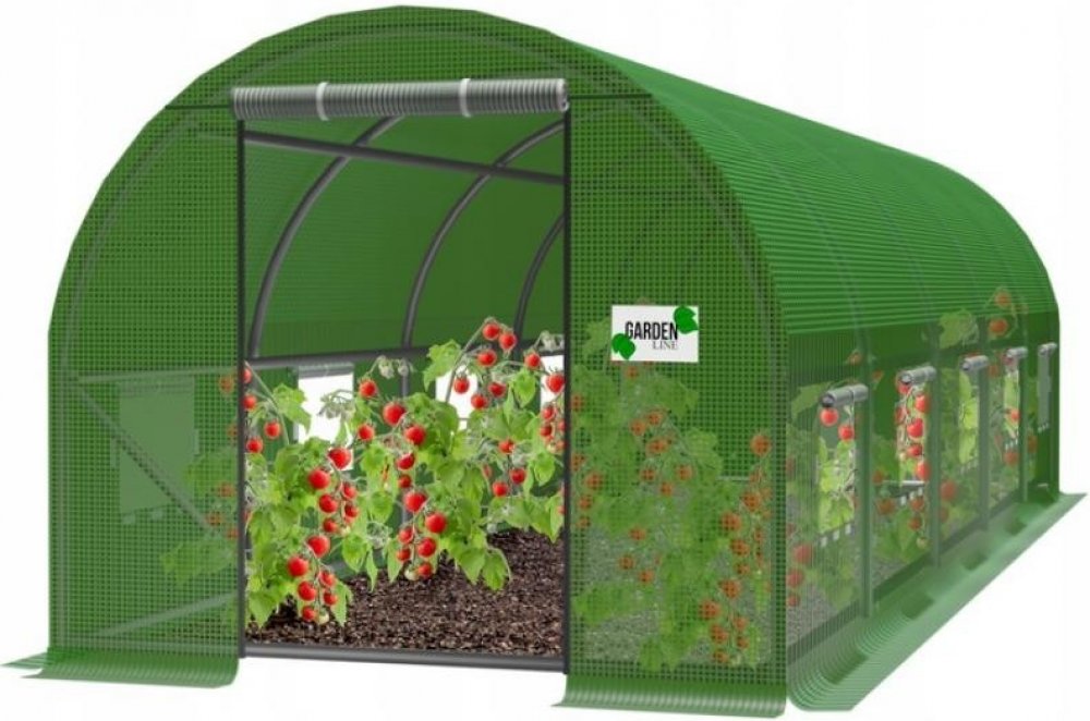 Zahradní fóliovník 5-segmentový - zelený 8x3x2mZahradní fóliovník značky GardenLine je výborným řešením pro ochranu rostlin před nepříznivým počasím, větrem a škůdci. Je ideální pro všechny pěstitele, kteří chtějí zefektivnit pěstování a vytvořit optimální mikroklima pro růst plodin. Fóliovník má prostorné rozměry 8 × 3 × 2 m, fólie s gramáží 140 g/m2 je vybavena UV 4 ochranou a vyztužena zelenou síťovinou (PP), která zvyšuje její odolnost proti roztržení. Pevná konstrukce z pozinkované oceli (trubky průměr 25 mm, tloušťka 0,7 mm) zaručuje stabilitu i při zhoršených povětrnostních podmínkách. Tunel je vybaven širokými předními dveřmi uzavíratelnými na zip, 10 bočními okny s moskytiérou (rolovatelná z vnější strany) a zemním límcem k zakotvení. V balení se nachází i kotvící sada.Technické údaje:Rozměry: 8 × 3 × 2 mMateriál fólie: PE 140 g/m2 s UV 4 ochranouKonstrukce: pozinkovaná ocel, průměr 25 mm, tloušťka 0,7 mmPočet segmentů: 5Počet dveří: 1Počet oken: 10 s moskytiérouRozměry dveří: 1,25 × 1,8 mZemní límec k zakotveníPříslušenství: 8 kotvících tyčí (11 × 120 mm)