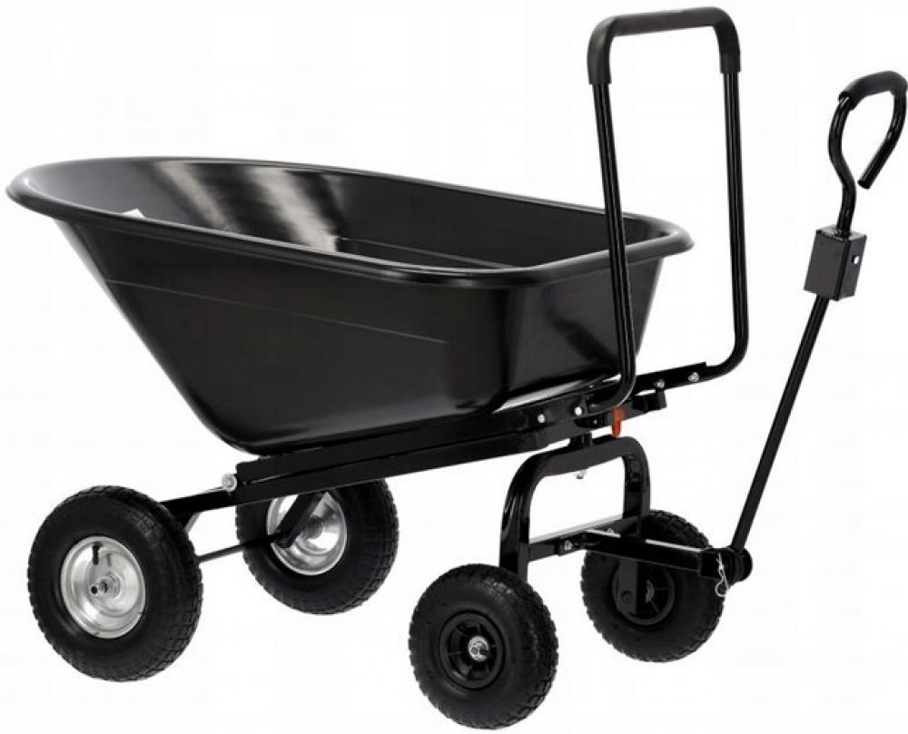 Zahradní vozík černý 160LPraktický zahradní vozík GardenLine je univerzálním pomocníkem na přepravu různých materiálů s nosností až 300 kg. Díky odolné konstrukci z polypropylenu, vyztužené kovovým rámem, bez problémů zvládne přenášet ovoce, zeminu, písek či jiné sypké materiály. Vozík je vybaven otočnou přední osou s možností manévrování až do 180 stupňů, což zaručuje vysokou ovladatelnost i v stísněných prostorách. Pumpované pneumatiky s hlubokým dezénem poskytují výbornou trakci v různorodém terénu. Práci zpříjemňuje ergonomická rukojeť s protiskluzovým povrchem. Díky své všestrannosti je vozík vhodný nejen na zahradu, ale i k použití ve skladech, dílnách či na poštách.Technické údaje:Rozměry: 120 × 84 × 96 cmKapacita nádoby: 160 lPřední pneumatiky: 10´´× 3,5 – 4Zadní pneumatiky: 13´´× 4,0– 6Délka rukojeti: 82 cmMaximální zatížení: 300 kgMateriál: ocel, guma, polypropylen (PP)