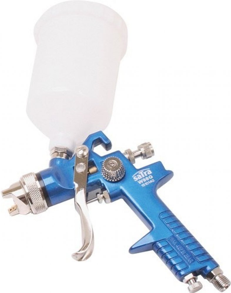 Stříkací pistole 1.4mm profi Satra W98G Stříkací pistole s nádobou 600 ml a tryskou 1,4 mm pro aplikaci vodou ředitelných laků, akrylových barev a barev s obsahem metalických a perleťových složek. Pistole umožňuje regulaci nástřiku barvy ve dvou rovinách.Technické údaje:Objem nádoby na barvu: 600 mlTlak: 2 bary1,4 mm mosazná tryska Spotřeba vzduchu: 300 l/min.Možnost nastavení vzduchu barvy a rozp...