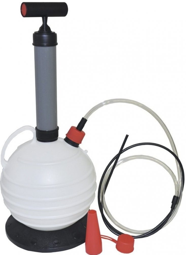 Velmi praktický přístroj pro ruční odsávání oleje (případně i vody) má zásobník o objemu 6 litrů. Používá se pro rychlé a čisté odsávání oleje z motorů osobních automobilů, motocyklů, zahradních sekaček, lodí, elektrických motorových generátorů a dalších motorů. Stejně dobře poslouží pro odsávání olejů z převodovek různých průmyslových, stavebních a zemědělských strojů apod. Velmi snadno lze ale takto odsávat kupříkladu i vodu z akvárií atd. Potřebný podtlak v zásobníku přístroje se vytvoří ručním pumpováním. Stačí zapumpovat 10 až 20 krát. Poté lze již zasunout odsávací hadičku do motoru, převodovky apod. a opotřebený olej (zpravidla teplý) odsát do kulovitého zásobníku. Ten je průhledný a má na sobě odměrné značky, aby bylo možno zjistit, kolik oleje se odsálo. Potom se olej ze zásobníku přeleje do větší nádoby (např. do sudu či kanystru s opotřebeným olejem). Zásobník je za tímto účelem opatřen vylévacím hrdlem. Celý proces odsávání opotřebených olejů se tak realizuje v dokonalé čistotě. Čerpadlo nad zásobníkem lze snadno odmontovat, takže přístroj při skladování zabere jen minimum místa. Přístroj má profesionální kvalitu, ale lze ho samozřejmě používat i pro domácnost a hobby-sektor. Parametry: objem zásobníku průměr zásobníku délka odsávací hadičky průměr odsávací hadičky