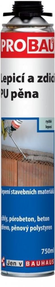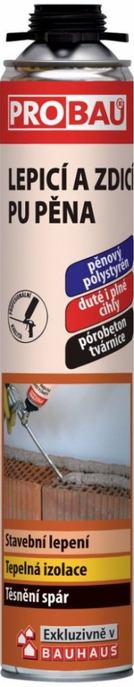 Nízkoexpanzní PU lepící a zdící pistolová pěna PROBAU se vyznačuje minimální rozpínavosti během vytvrzování (méně než 50 %) a tím minimalizuje tlak na okolní plochy. Tato pěna vyniká vysokou přídržností k podkladům, jako je beton, zdivo, dřevo, polystyrén a dalších stavebních materiálů (kromě plastů). Má také skvělou výtěžnost, vynikající stabilitu (nesmršťuje se, nehrozí pozdější rozpínání) a dobré tepelně a akusticky-izolační vlastnosti. Díky pistolovému systému je zaručena velmi přesná aplikace. Je určena pro vyplňování spár při montáži okenních rámů, dveřních zárubní, izolace potrubních systémů, utěsňování průchodů ve stěnách, lepení parapetů nebo pro vyplňování spár mezi tepelně izolačními deskami. Bez obsahu CFC (nepoškozuje ozónovou vrstvu).