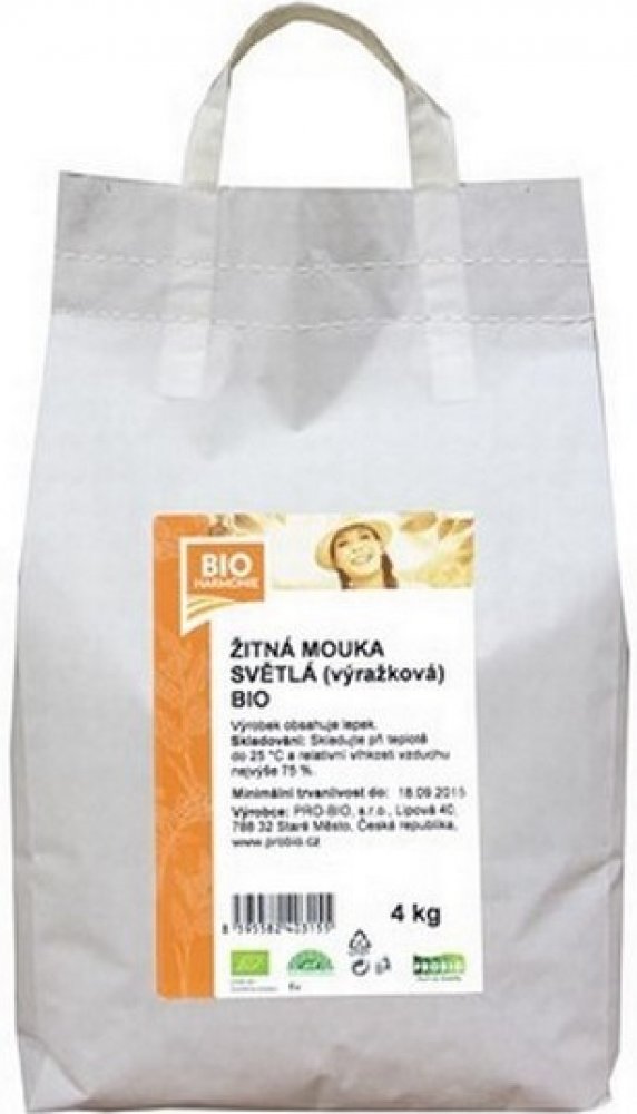 PROBIO Žitná mouka výražková BIO 4000 g. Složení: Žitná mouka* světlá 100% *CZ-BIO-001 produkt ekologického zemědělství Skladování: Skladujte na temném, chladném a suchém místě. Mouky probio jsou vyráběny v bio mlýně v malých šaržích tak, aby se k zákazníkovi mouka dostala vždy co nejčerstvější.
