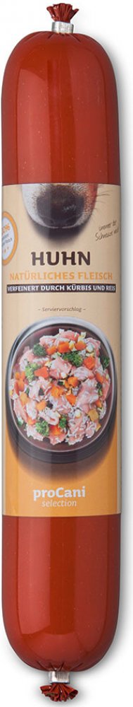 proCani: stačí rozkrojit a mlsat: proCani Kochwurst kuřecí menu s dýní a rýží je lahůdkou pro psy všech věkových skupin, které vyniká vyváženou, přirozenou recepturou. Hlavní surovinou tohoto krmiva je kuřecí v podobě lahodného kuřecího masa, jater, srdíček a plic. Kochwurst od proCani je žádanou změnou oproti běžnému mokrému krmivu a nabízí Vašemu čtyřnohému příteli plnohodnotné menu se všemi důl...