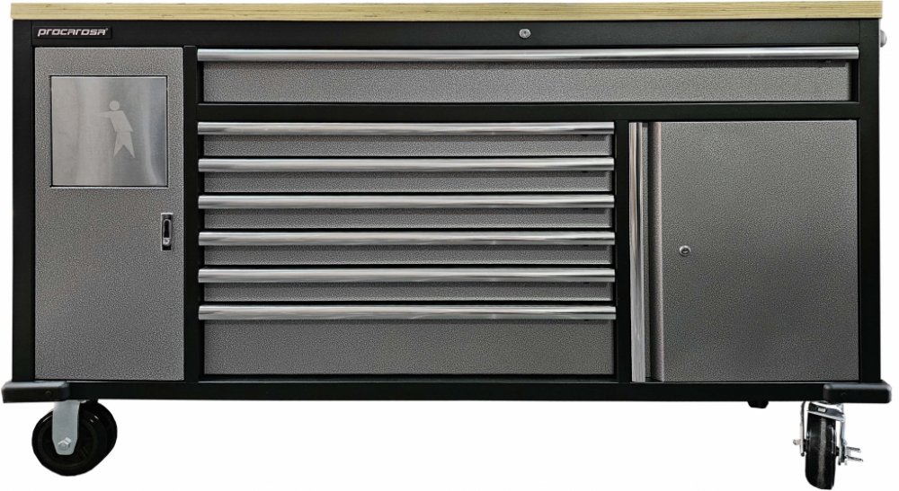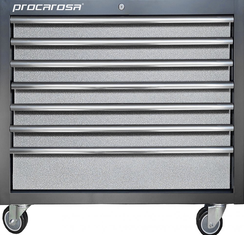 Dílenský uzamykatelný box Procarosa PROFI TGC-1307W se sedmi zásuvkami na kuličkových ložiscích. Zásuvky jsou vybavené protiskluzovou pěnovou podložkou pohlcující zvuk.
