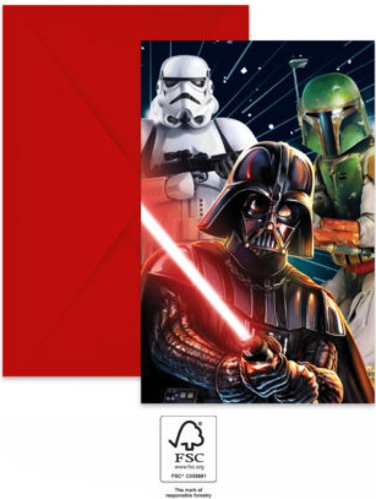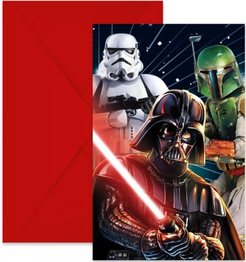 Každá oslava by měla začínat pozvánkou. Proto rozešlete svým kamarádům tyto pozoruhodné pozvánky s obálkami Star Wars a dejte jimi najevo, v jakém tématu se bude vaše oslava konat. Papírové pozvánky jsou velikosti 10 x 14 cm Balení obsahuje 6 ks pozvánek s červenými obálkami