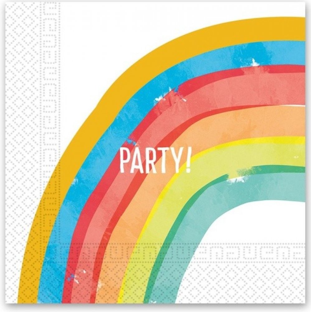 DUHOVÉ PAPÍROVÉ UBROUSKY Rozměry ubrousku: 33 x 33 cm Barva: Vícebarevná Potisk: Rainbow, nápis Party! Materiál: papír Počet kusů v balení: 20