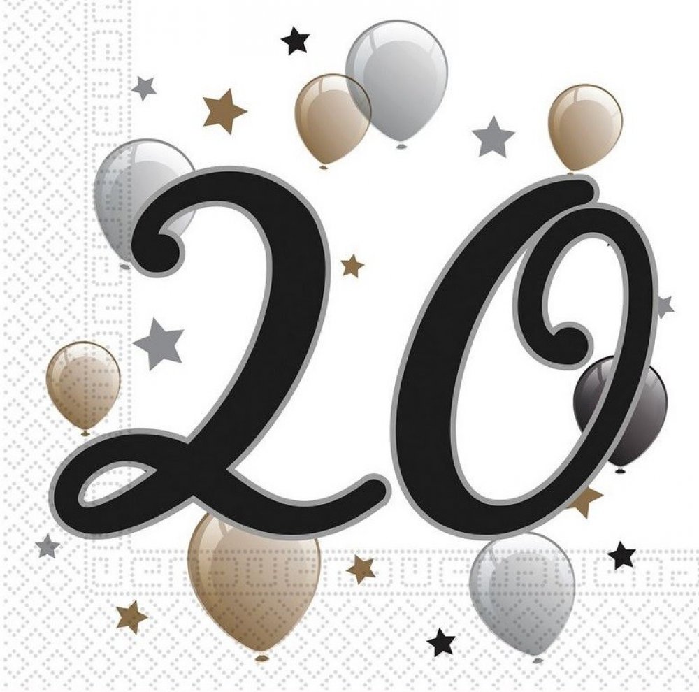 Papírové ubrousky s číslovkou 20. Servírovací papírové ubrousky pro malé i velké oslavy narozenin. Papírové ubrousky s dvacítkou. Bílé ubrousky s černozlatým potiskem. Perfektní doplněk, který by neměl chybět na žádné oslavě 20. narozenin.