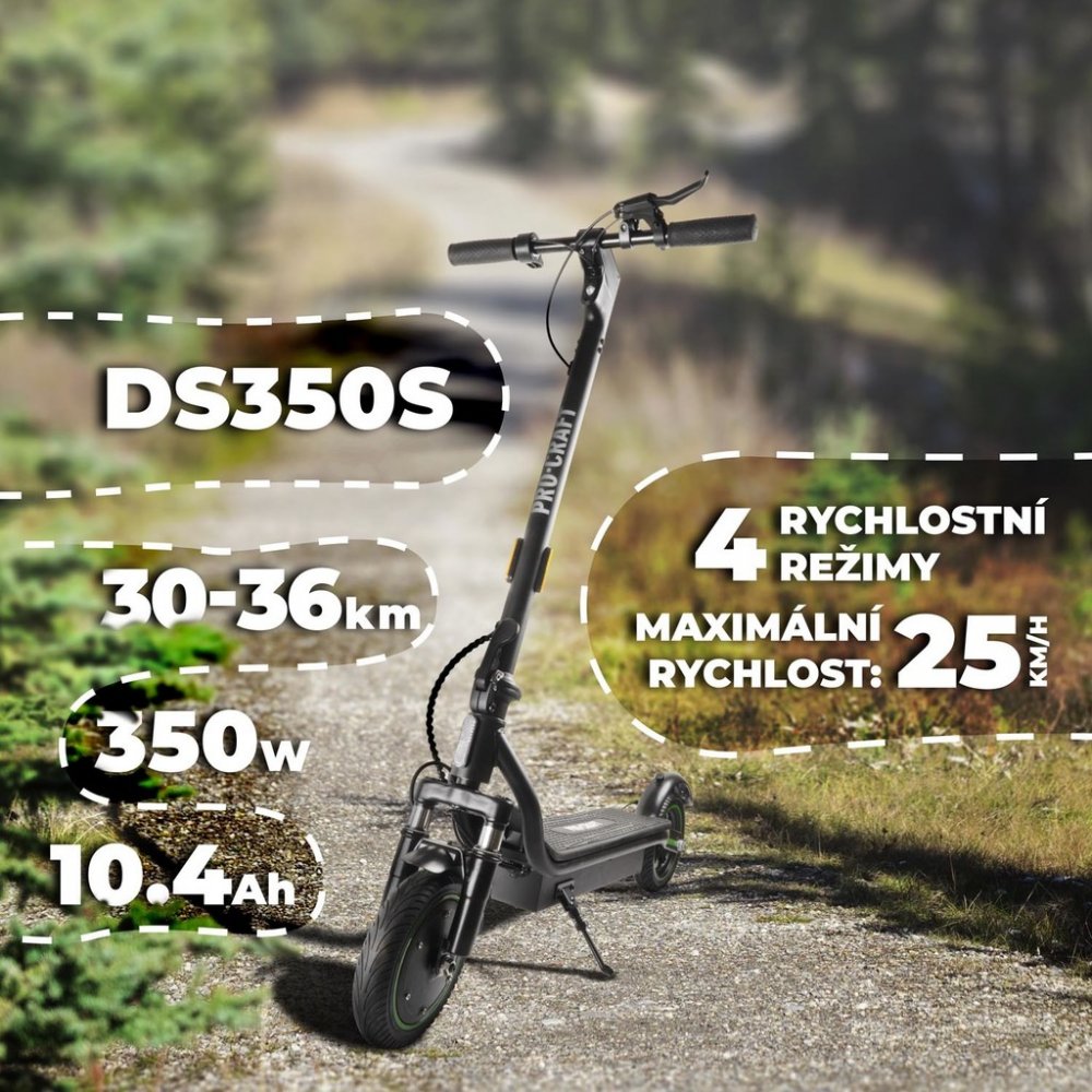 DS350S je vybavena výkonným 350W motorem, který dosahuje maximální rychlosti až 25 km/h. K dispozici jsou čtyři jízdní režimy (Chodecký, ECO, Standard, Sport), které vám umožní přizpůsobit rychlost aktuální situaci. Pro bezpečné zastavení je koloběžka vybavena zadní kotoučovou brzdou, která zajišťuje spolehlivý a plynulý brzdný účinek.