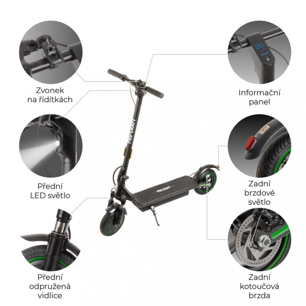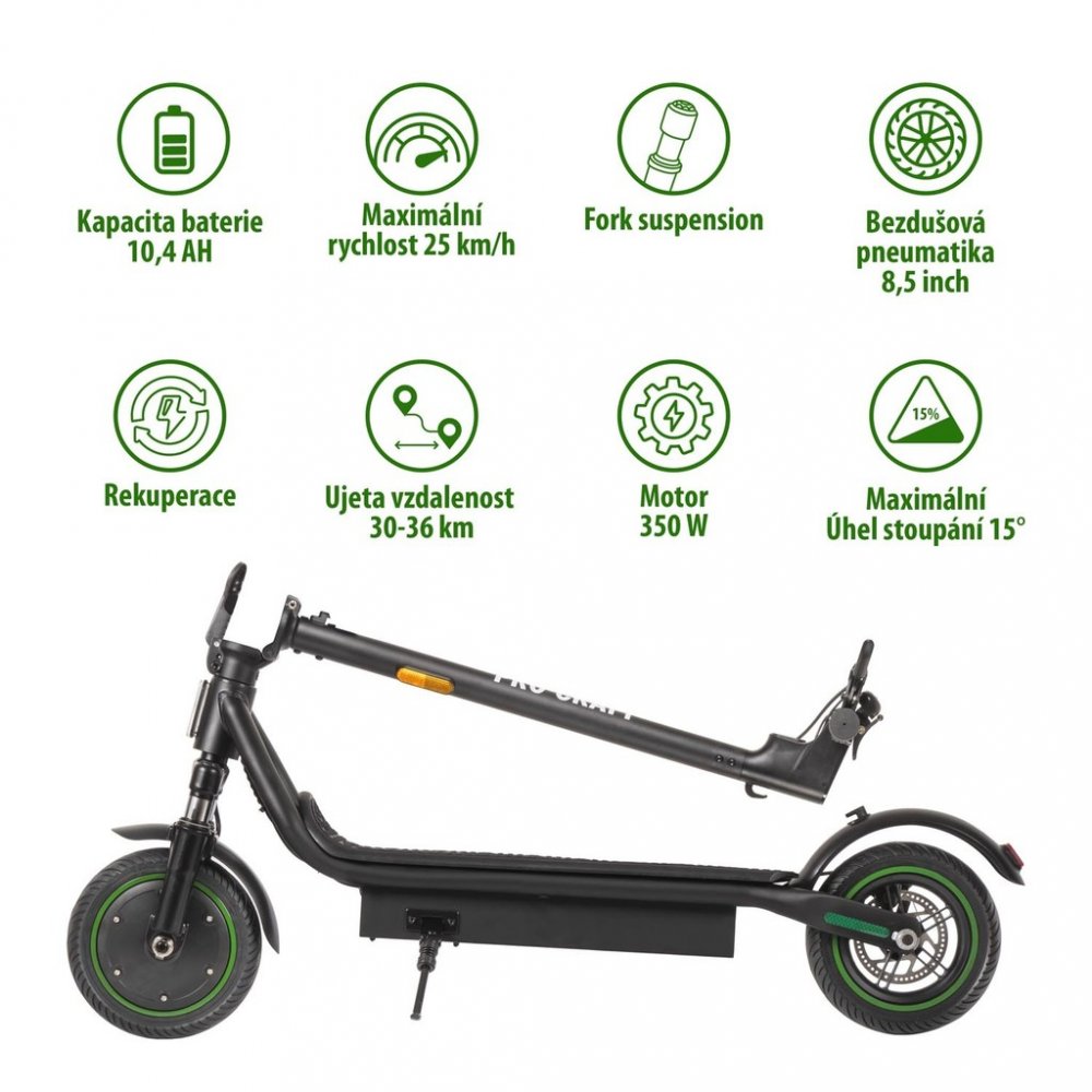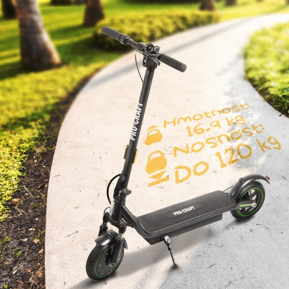 Procraft 350 W 16.7 kg 120 kg 25 km/h 36 km pro dojíždění do práce (25–40 km) třída jízdní kolo 10400 mAh vhodné pro asistované přenášení (13–20 kg) IPX4 pro městské cesty s občasnými nerovnostmi pro jízdu v slabém dešti 216 mm pneumatické kombinované vhodné pro nákupy a tašky 8.0 h