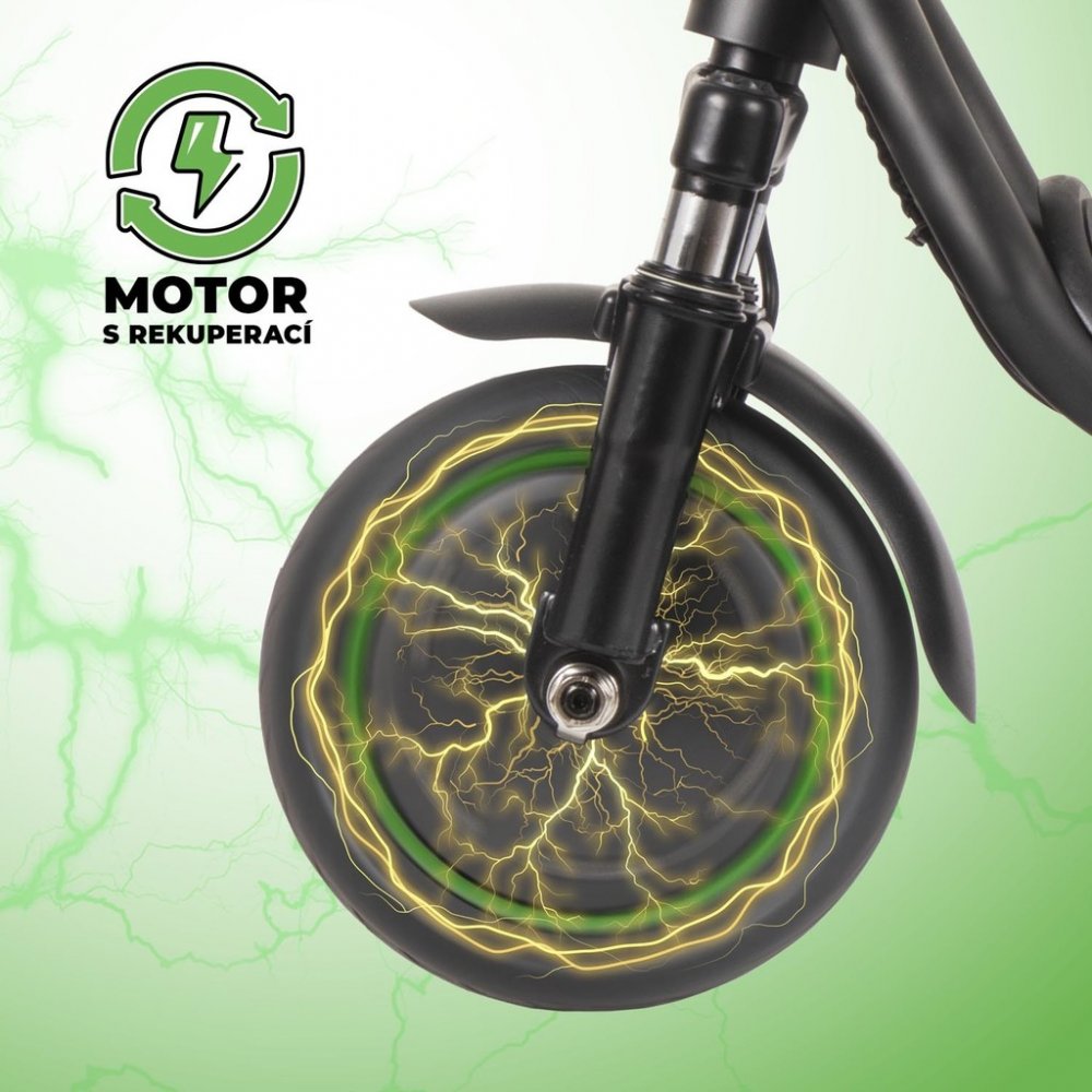 Koloběžka využívá 36V 10400mAh baterii, která ve spojení s rekuperačním brzdovým systémem a funkcí tempomatu přináší efektivní a úsporný provoz. Rekuperace při zpomalování vrací část energie zpět do baterie, zatímco tempomat pomáhá udržet konstantní rychlost bez nutnosti držet páčku plynu. Díky této technologii dosahuje koloběžka dojezdu až 36 km na jedno nabití. Plné nabití trvá přibližně 8 hodin.