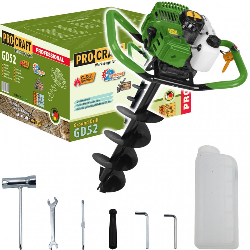 Zemní vrták Procraft GD52 je vhodný pro profesionály i domácí kutily, kteří hledají spolehlive a výkonné nářadí pro práce s půdou a zemními materiály.