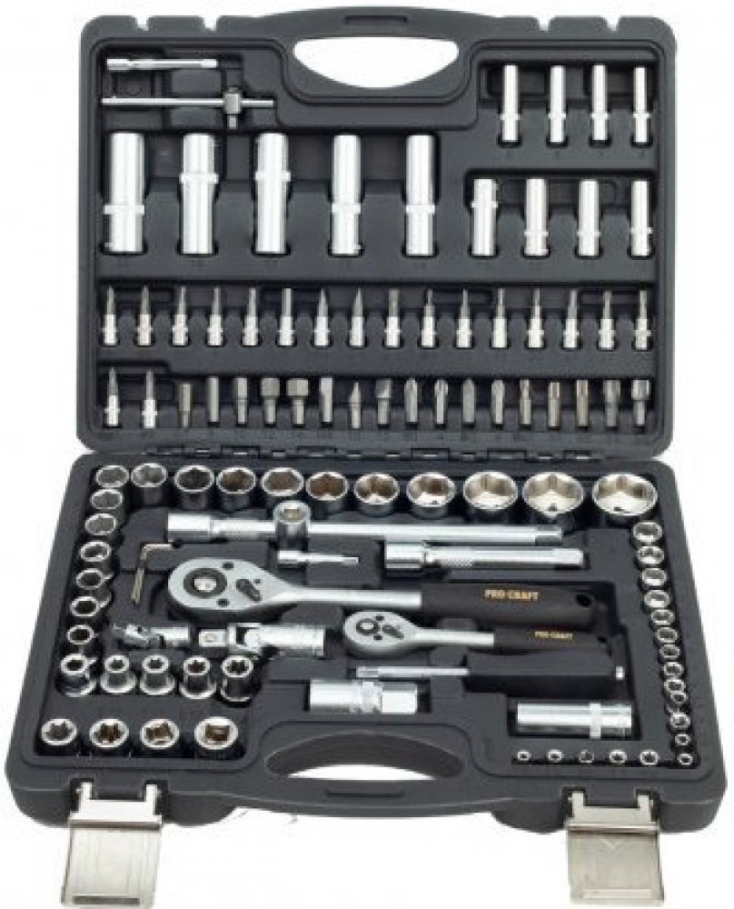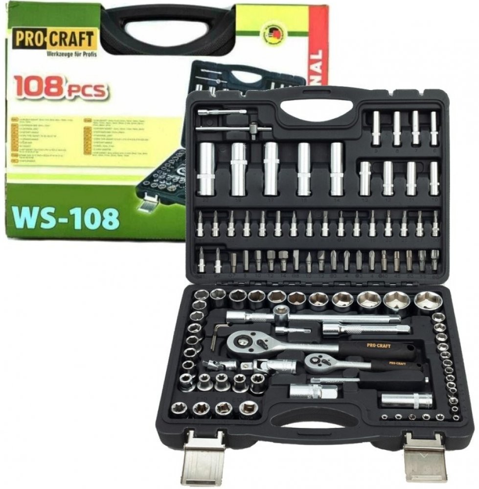 Gola sada Procraft WS-108 108 dílů je určena k použití v domácí dílně, ale i pro mechaniky. Hlavice a ráčny jsou vyrobeny z kvalitné chrom-vanadiové oceli (CRV) chrání proti korozí a tvrdý povrch produžuje životnost. Ráčny mají 48 zubů v rohatkovém převodu a jsou vybaveny páčkou. Odolný plastový kufr s kovovým zavíráním usnadňuje dlouhodobé použití a přenášení. Přehledně roztříděné nářadí usnadňují a zrychlují práci. Sada obsahuje ráčny, bity, nástrčné hlavice, šestihranné klíče, vratidla, univerzální klouby, prodlužovací nástavce a šroubovák pro nástrčné bity. Součástí dodávky je plastový kufr.
